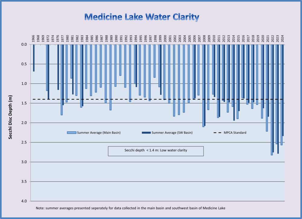 Medicine Lake has high nutrient levels which periodically makes the water unsuitable for swimming and wading due to low clarity and excessive algae growth. Additionally, the lake was recently classified by the State as a “high risk water” for high chloride levels, likely coming from deicers used in the winter.