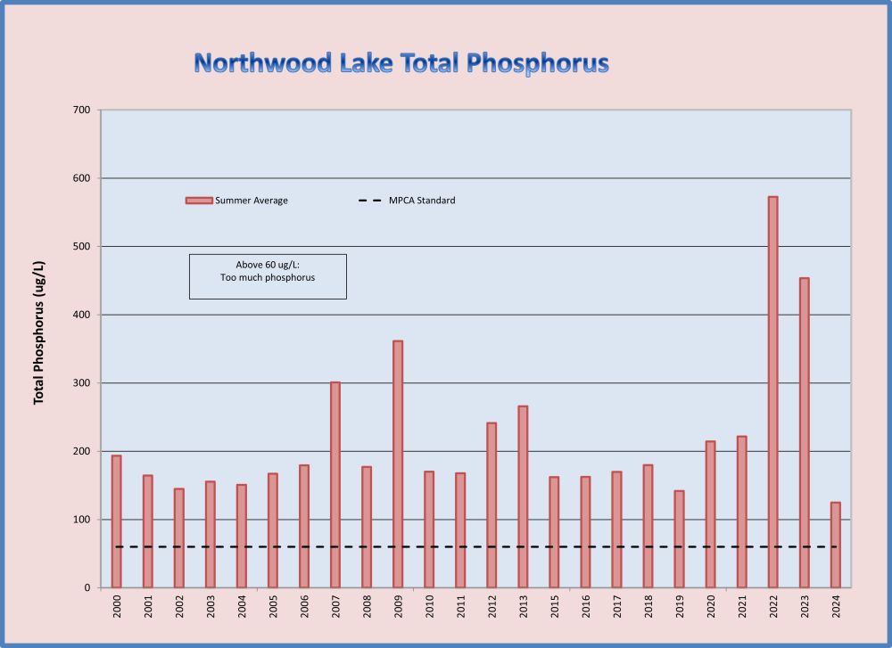 Northwood Lake has exhibited high nutrient levels since 2000 and is listed in the MPCA's impaired waters list for high nutrients and chlorides. Curlyleaf pondweed, an aquatic invasive plant, is also present in the lake and was found at extremely high levels in 2019. The BCWMC and the City of New Hope implemented a multi-phase water quality improvement project in Northwood Park in 2016 and 2017 to reduce nutrient levels in the lake. The project was partially funded by a Clean Water Partnership grant from the MPCA, a Clean Water Fund grant from the Minnesota Board of Water and Soil Resources, and the City of New Hope.