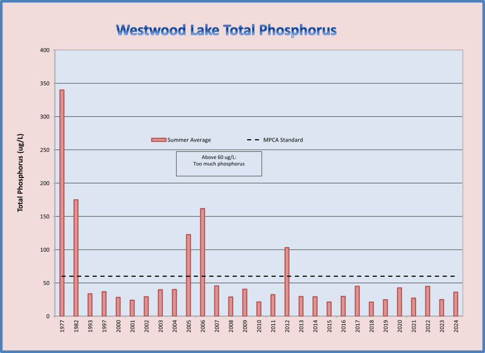 Overall water quality in Westwood Lake is good for a shallow, metropolitan lake. Its water quality and total phosphorous concentrations meet Minnesota Pollution Control Agency water quality standards and is not on the state's Impaired Waters list. The aquatic invasive species Curlyleaf pondweed is present in Westwood Lake.